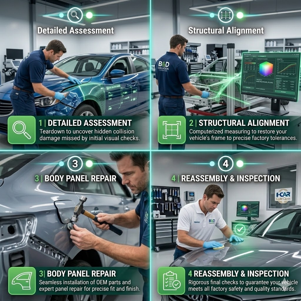 1. Detailed Damage Assessment: We begin with a thorough teardown. We look past the obvious surface dents to uncover any hidden damage that an initial visual insurance estimate may have missed.